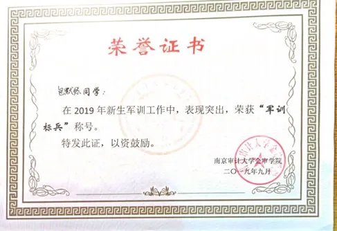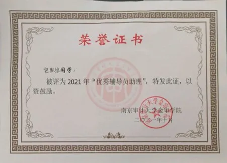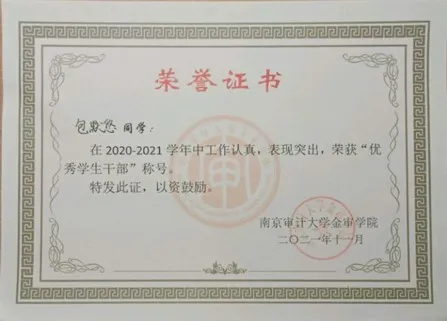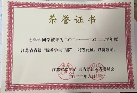 2019校军训标兵,19-20学年校优秀干事,20-21学年校优秀团员,20-21学年校优秀学生干部,2021、2022年校“先进个人”,2021年校优秀辅导员助理,2021-2022学年省级“优秀学生干部”