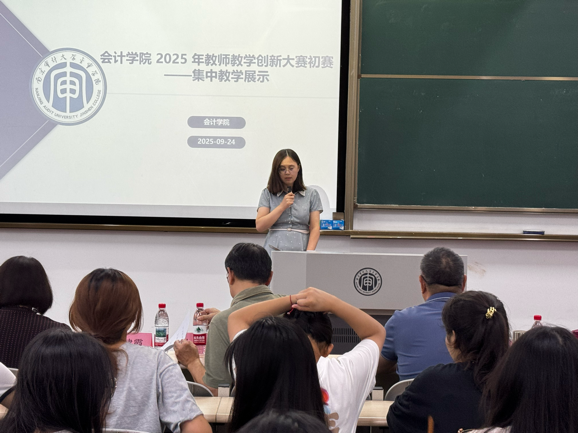 根据《会计学院 2025 年教师教学创新大赛初赛实施方案》安排,9月24日13:30,集中教学展示环节在C中503教室顺利举行。南京审计大学金审学院纪委书记沈明,会计学院院长吴中春教授,校教学督导温美琴教授、冯建霞副教授出席活动,会计学院教学创新大赛工作小组、全体专任教师及部分学生代表共同参与。本次赛事由会计学院副院长胡爱平主持。