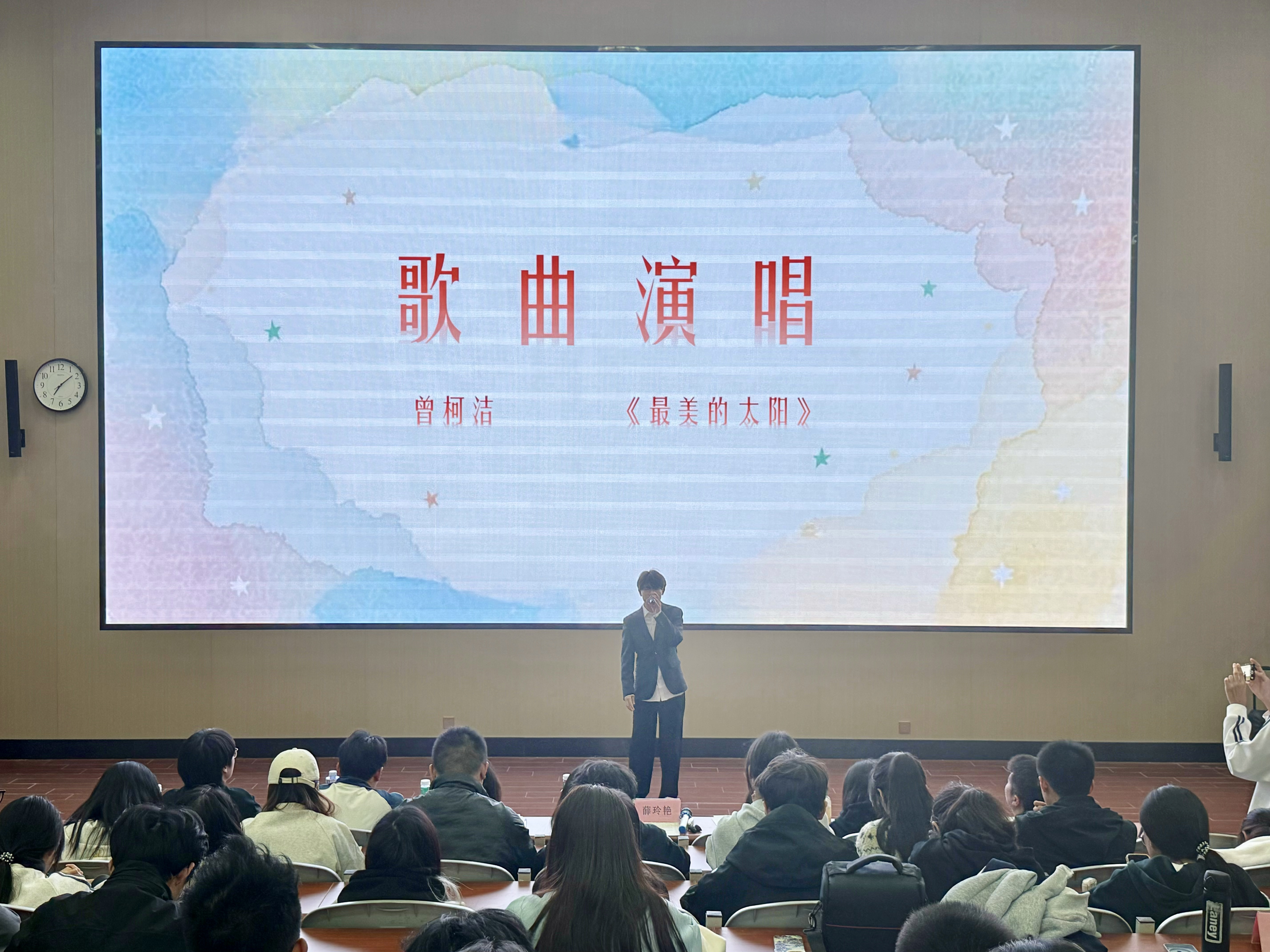 艺术团的曾柯洁为比赛活动倾情献唱一曲《最美的太阳》,将现场的热烈氛围推上高潮,赢得了观众的掌声。