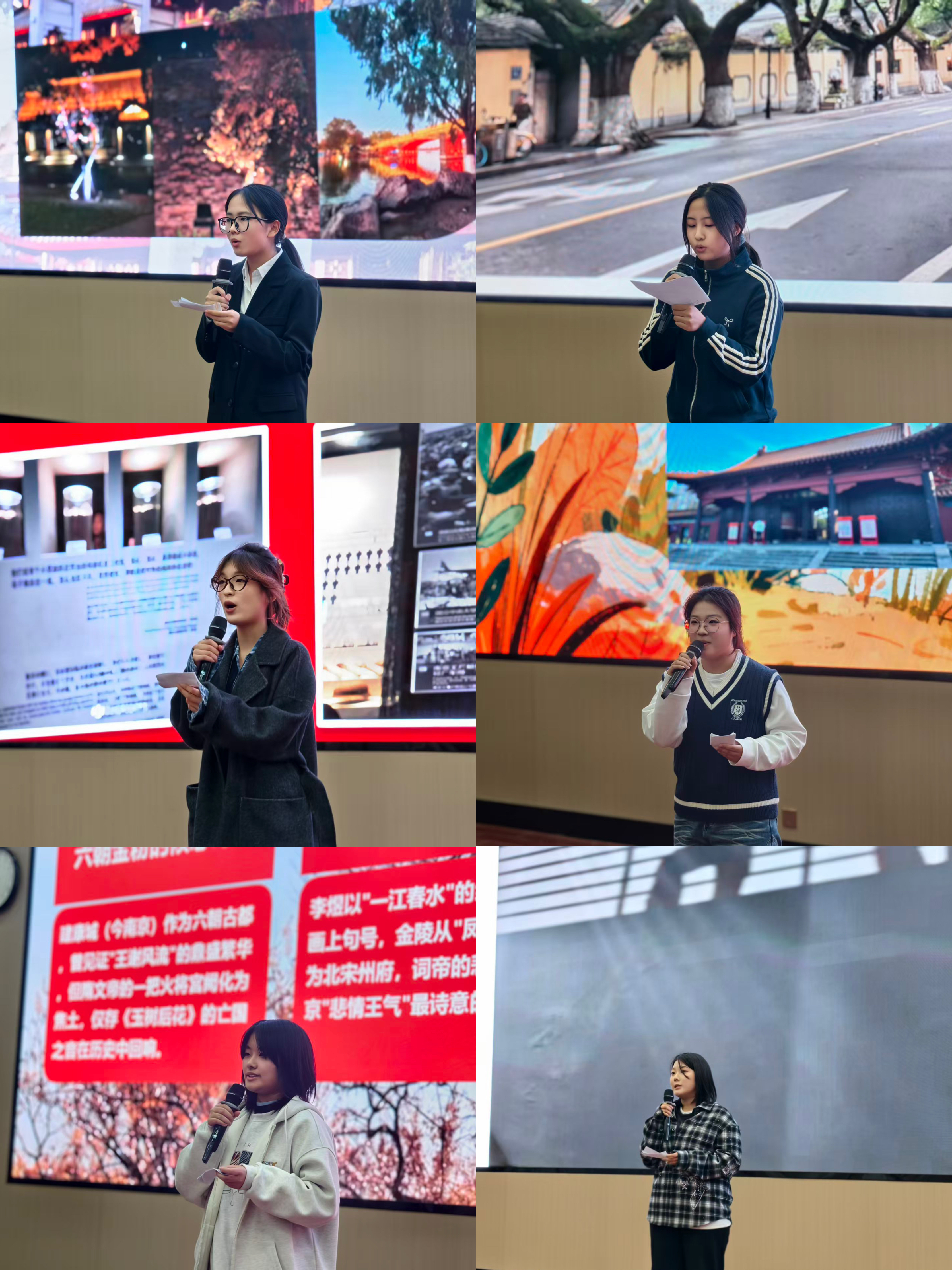 本次共有6名同学挺进决赛,选手们借助PPT、vlog和照片集等多种方式表达对南京的热爱。王婧瑶同学分享了自己在大学的生活,于点滴处发现生活的美好。陈欣怡同学用vlog的形式讲述自己参观侵华日军南京大屠杀遇难同胞纪念馆的经历,深刻领悟先辈们的爱国情怀和民族气节。赵艾嘉同学通过梳理历史时间轴,读懂了南京城“宫阙终成土,风骨立天地”的文化基因与精神谱系。陈佳沂同学以明城墙和秦淮河两处为切入点,窥见南京历史与现代的交融。丁慧茹同学以怀古南京为主题,在桨声灯影里触摸历史的温度。马昕怡同学将自己的经历融入讲述,描绘了自己眼中厚重且轻盈的金陵城。