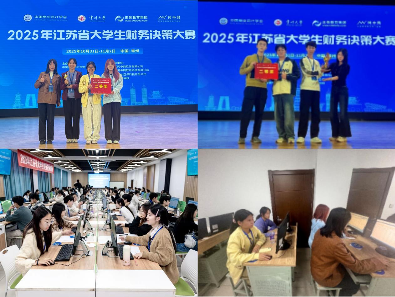 2025年11月1日,由江苏省高等教育学会指导、中国商业会计学会主办、常州大学承办的2025年“网中网杯”江苏省大学生财务决策大赛在常州大学西太湖校区顺利举行。本次大赛作为纳入江苏省高校学科竞赛评价体系的重要赛事,吸引了来自南京审计大学、南京信息工程大学、江苏大学等全省多所高校的44支代表队参与,竞争激烈。在为期一天的激烈角逐中,我校会计学院派出的两支代表队凭借扎实的专业功底、稳定的赛场发挥和出色的团队协作能力,双双荣获省级二等奖。同时,指导老师周莎、马悦荣获“优秀指导教师”称号。