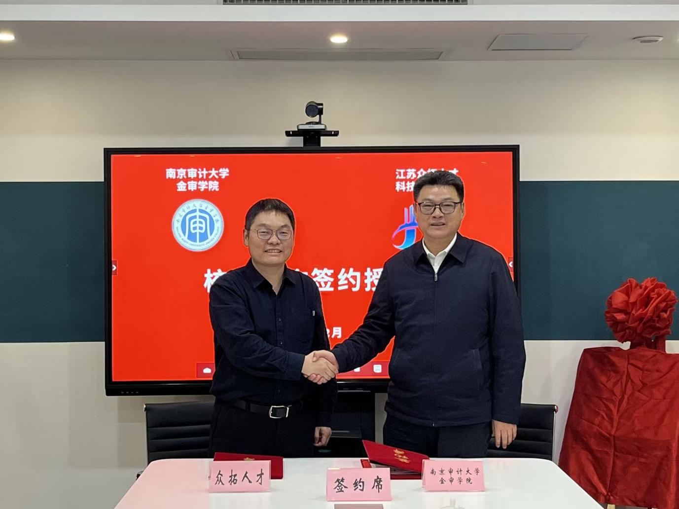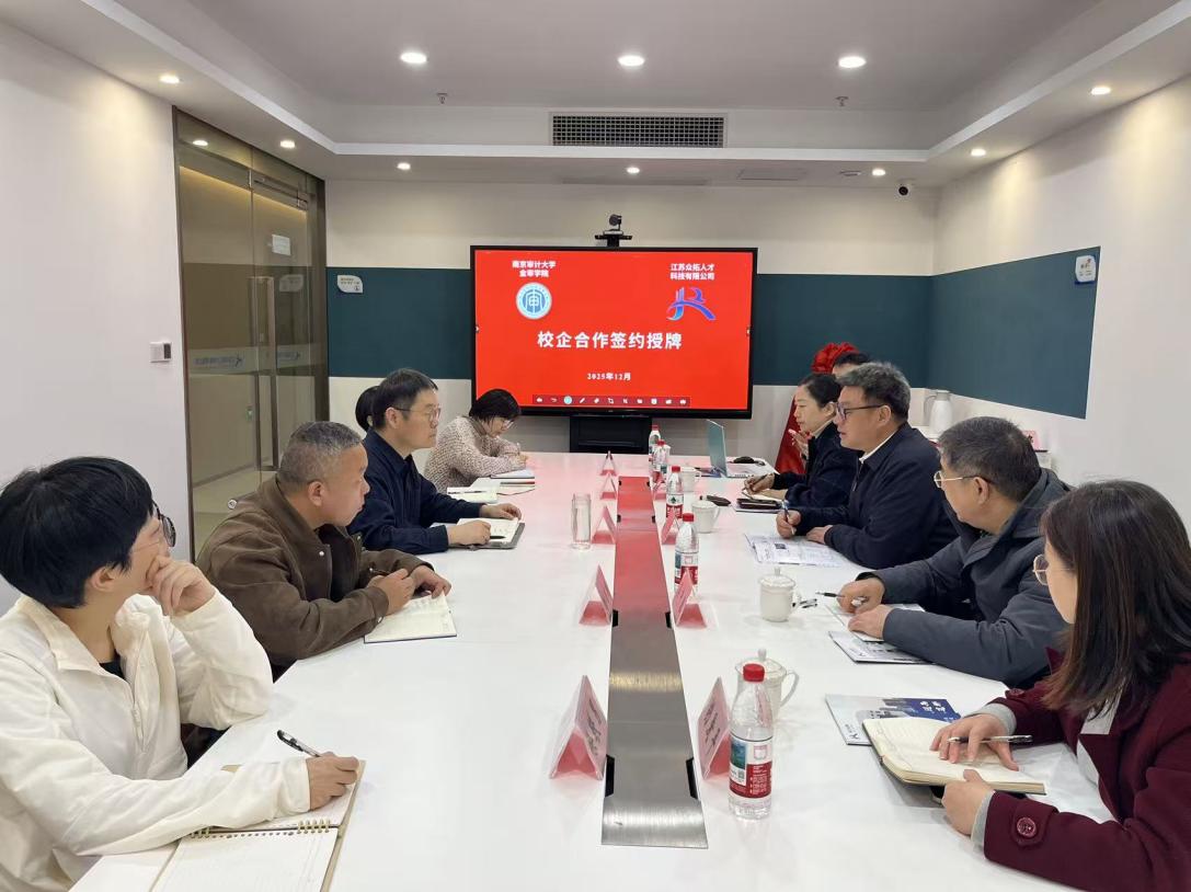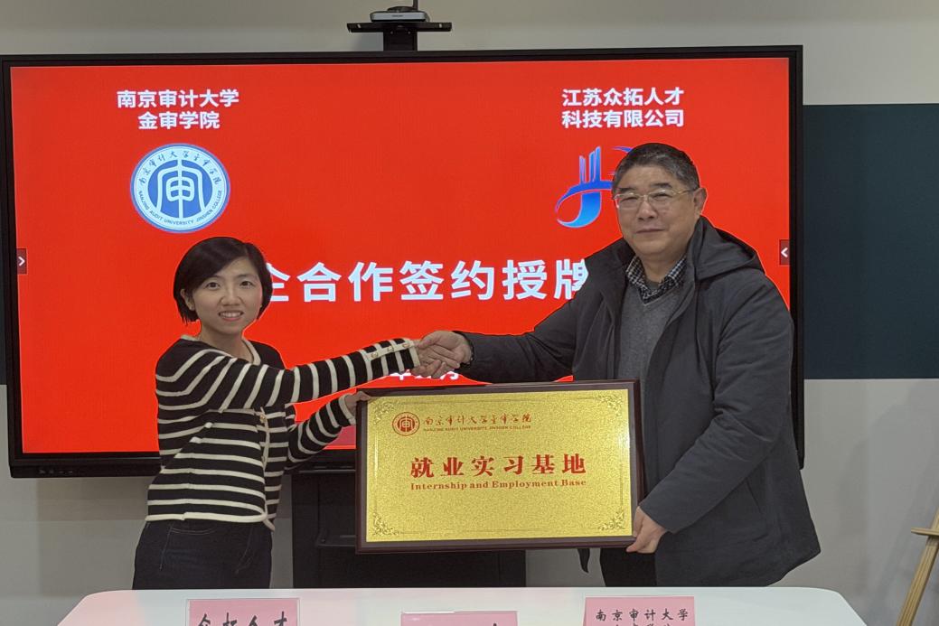 为精准对接行业人才需求,扎实推进访企拓岗行动,深化校企合作与产教融合,12月2日下午,南京审计大学金审学院副校长胥亮带队赴江苏众拓人才科技有限公司,出席校企合作签约暨就业实习基地授牌仪式。会计学院院长吴中春、党总支书记于璐、副院长胡爱平,以及江苏众拓人才科技有限公司负责人共同参加仪式。