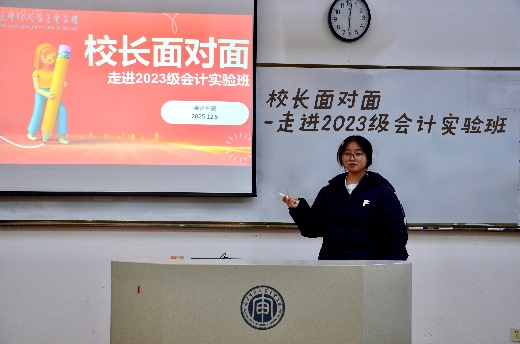 为倾听会计学子真实诉求、搭建校生直接沟通桥梁,助力学子明确专业发展方向与未来规划,南京审计大学金审学院会计学院于12月5日下午在 B 北 503 教室举办“校长面对面”活动。南京审计大学金审学院副校长胥亮、会计学院院长吴中春、党总支书记于璐、学生处副处长刘颖及会计学院辅导员林颖书与2023级会计实验班学子围坐交流,围绕成长发展话题深入沟通,凝聚师生共识,精准回应学生关切的各类疑问与合理诉求。