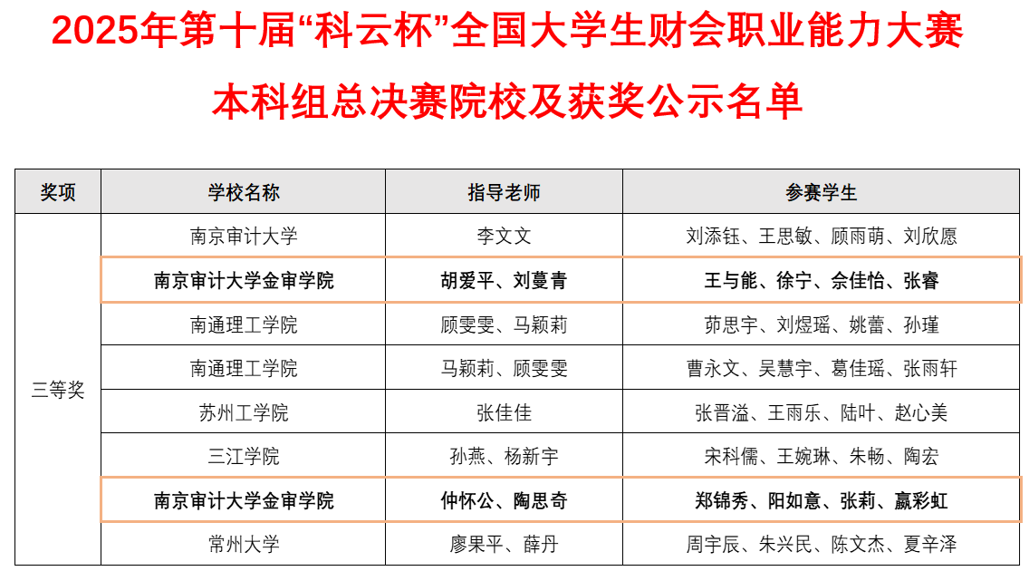 2025年11月22日,第十届“科云杯”全国大学生本科组财会职业能力大赛圆满落幕。我校两支参赛队伍在仲怀公、胡爱平、刘蔓青、陶思奇四位教师的悉心指导下,凭借扎实的专业功底、默契的团队协作与娴熟的数智化技能脱颖而出,双双斩获全国三等奖,彰显了我校学生过硬的财会职业能力。