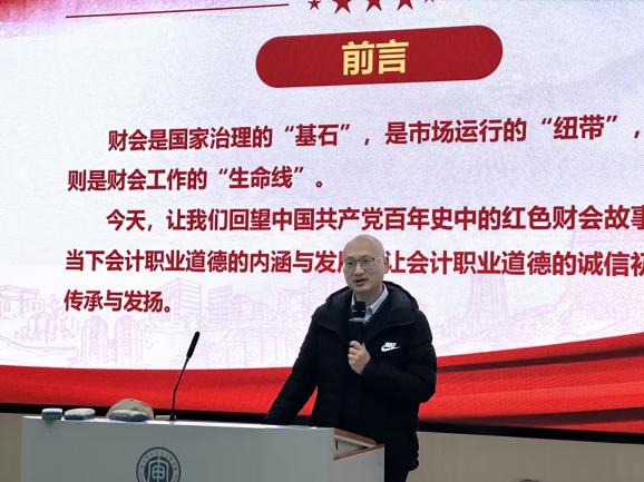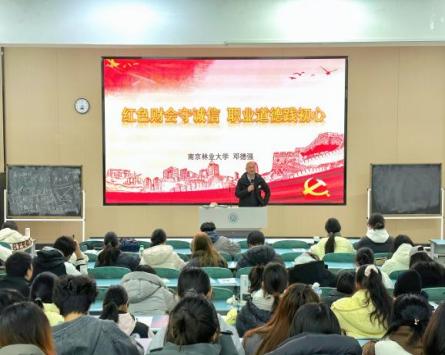 为深入传承红色金融基因,厚植财会专业学子职业道德根基,引导青年学子牢固树立诚信执业理念,会计学院于12月17日下午,在B南109教室隆重举办红色财经专题讲座。本次讲座特邀南京林业大学经济管理学院副院长邓德强教授担任主讲嘉宾,围绕“财会诚信与职业道德”核心主题展开深度分享,与现场师生共同探寻红色财经精神的时代内涵,擘画新时代财会人践行职业操守的实践路径。