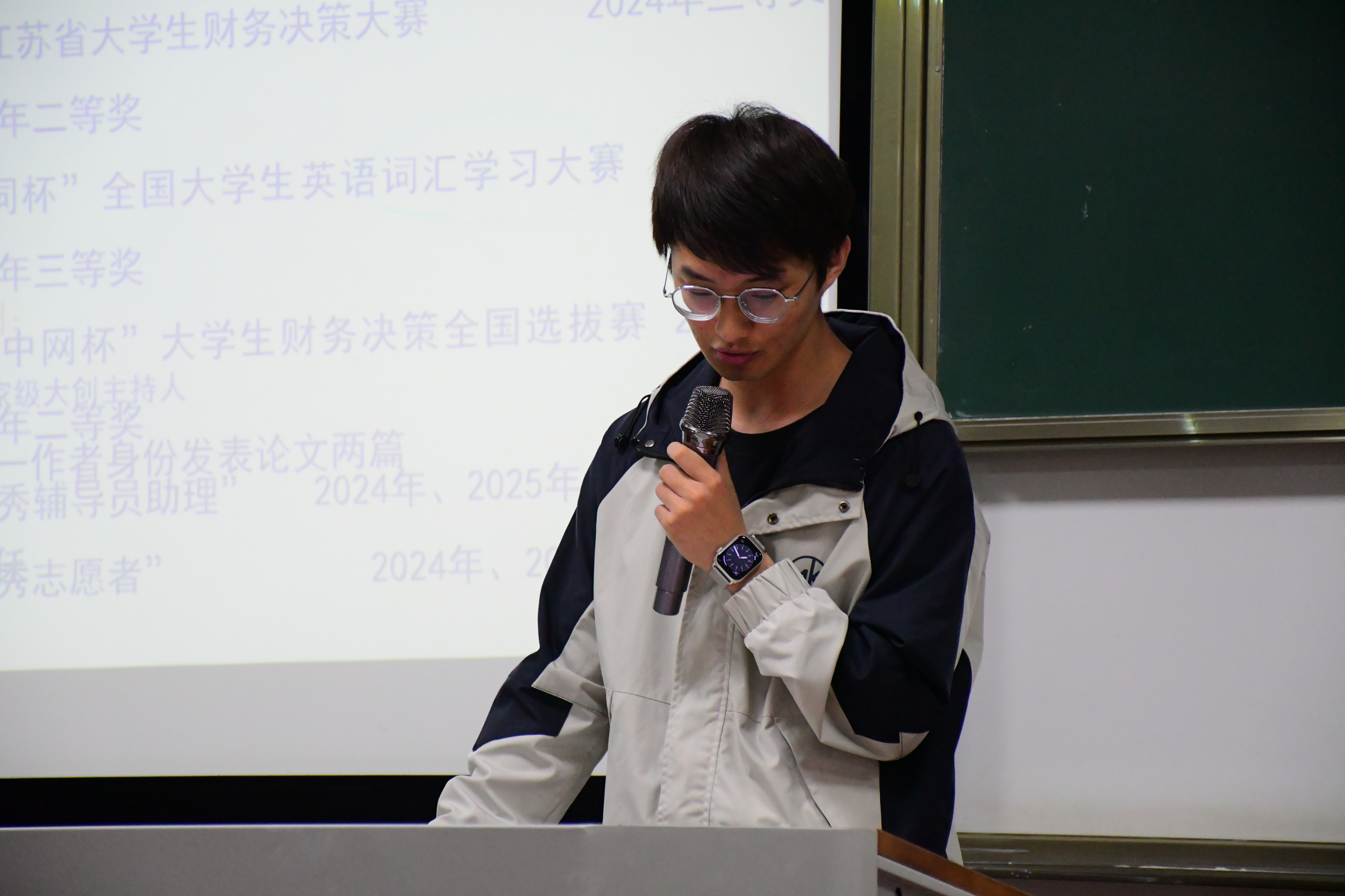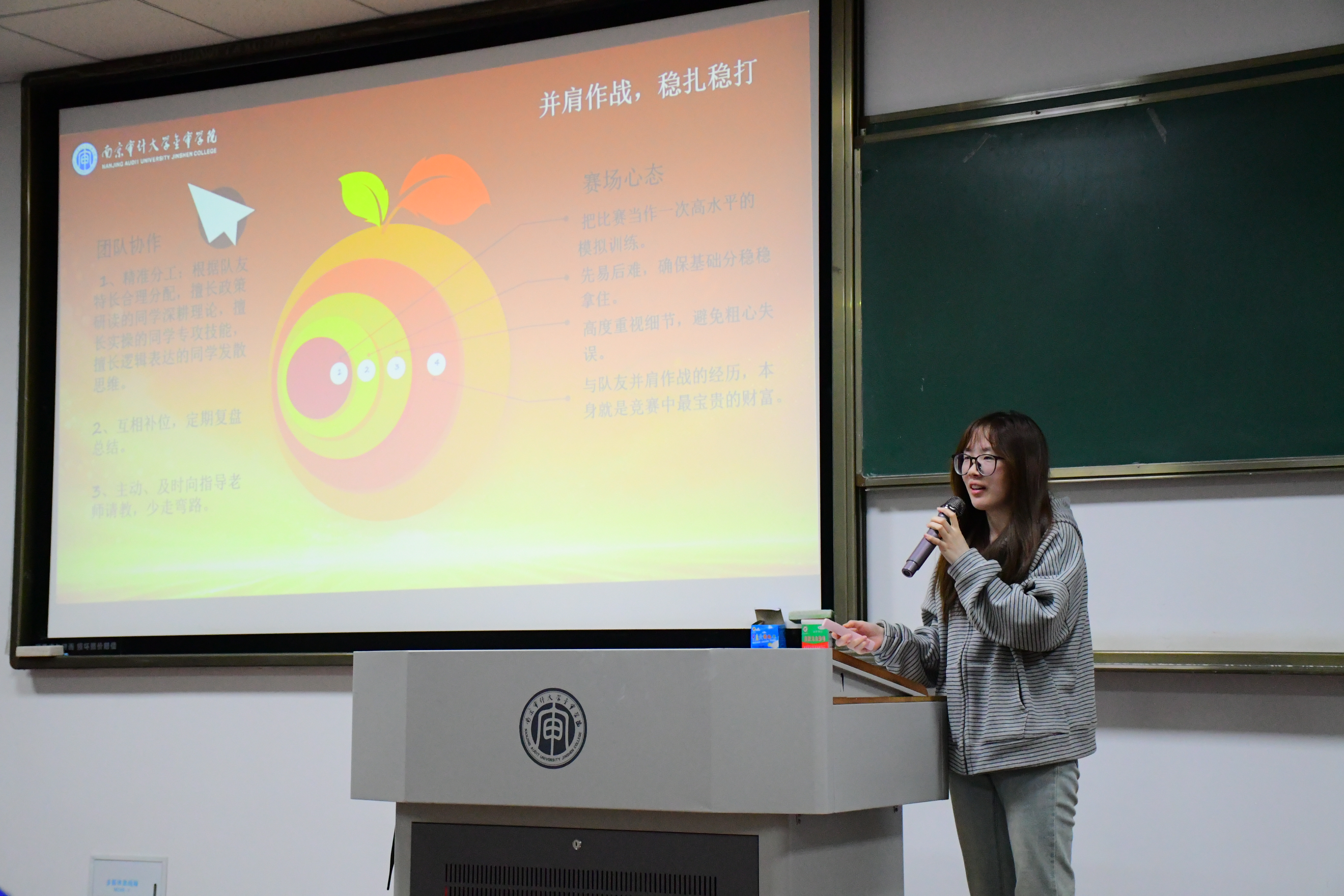 随后,佘佳怡、柳盈两位学姐带来财会类竞赛实战分享。佘佳怡结合数智化商业决策、科云杯、金蝶杯等高水平赛事,讲解团队分工、模拟经营、心态调整等关键技巧;柳盈从衡信杯、金砖杯等赛事出发,分享高效备赛方法、政策研读、数据应用与团队协作经验,强调“先易后难、稳扎稳打”,为备赛提供可直接复用的方法论。